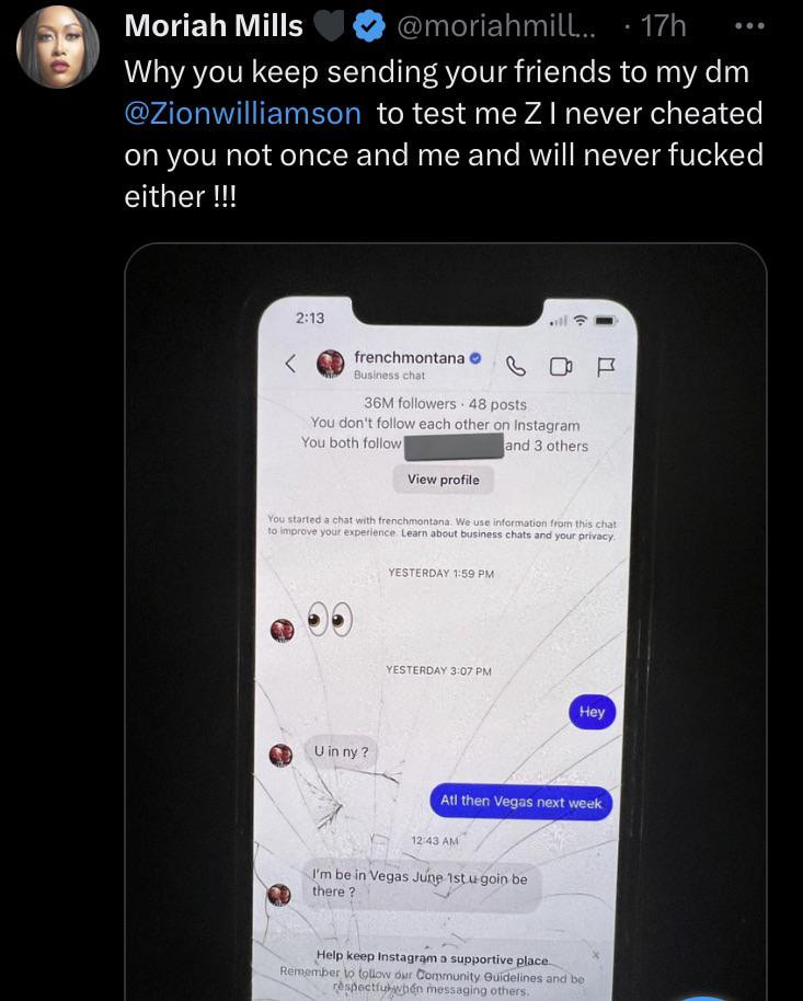 She posted a screenshot of DMs from French Montana, suggesting Zion sent friends to check her loyalty.