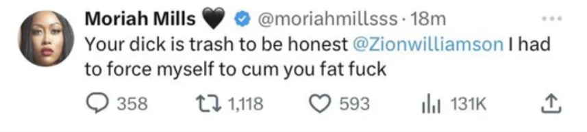 “Your dick is trash to be honest @Zionwilliamson I had to force myself to cum you fat fuck”