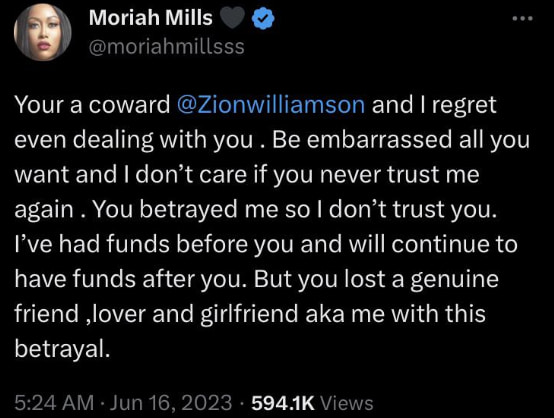 “Your a coward @Zionwilliamson and I regret even dealing with you. Be embarrassed all you want and I don’t care if you never trust me again. You betrayed me so I don’t trust you. I’ve had funds before you and will continue to have funds after you. But you lost a genuine friend, lover and girlfriend aka me with this betrayal.”