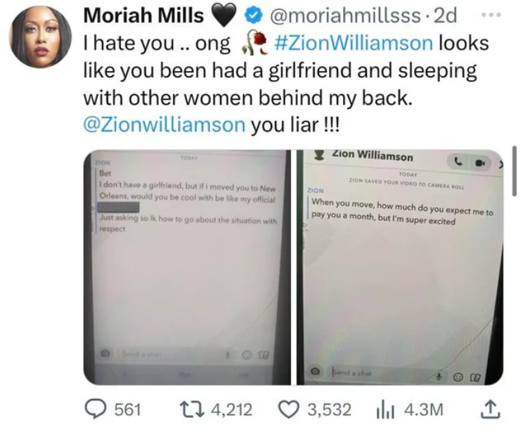 “I hate you .. ong 🎤 #ZionWilliamson looks like you been had a girlfriend and sleeping with other women behind my back. @Zionwilliamson you liar !!!”