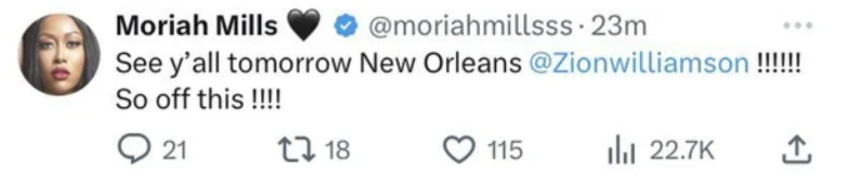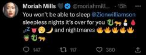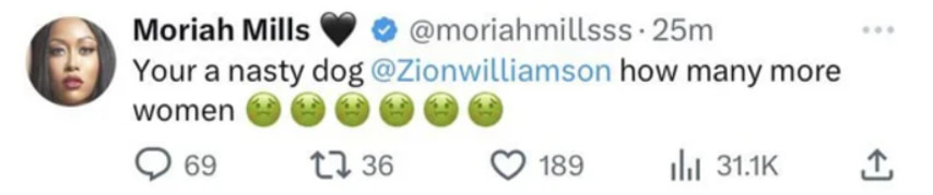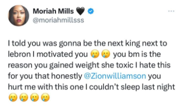 The tweets included personal accusations, references to private conversations, and criticism of Williamson’s actions. The situation escalated when Mills mentioned sex tapes and called for Williamson to be traded. Her account was later suspended. Below are some of the most direct and widely viewed tweets from the situation.
