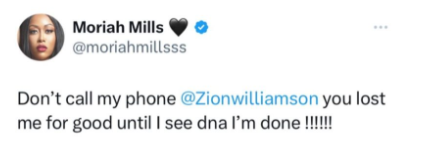 “Don’t call my phone @Zionwilliamson you lost me for good until I see dna I’m done !!!!!”