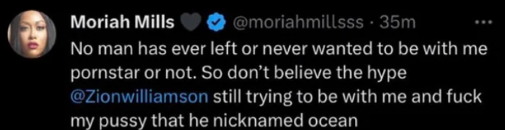 “No man has ever left or never wanted to be with me pornstar or not. So don’t believe the hype @Zionwilliamson still trying to be with me and fuck my pussy that he nicknamed ocean”