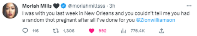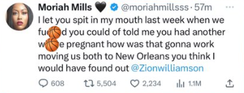 Moriah Mills posted a series of tweets directed at NBA player Zion Williamson after it was announced that he was expecting a child with another woman. In her tweets, Mills shared information about their past interactions, including claims that he offered her money, gifts, and talked about moving her to New Orleans. She also said she felt misled and betrayed.