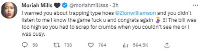 “I warned you about trapping type hoes @Zionwilliamson and you didn’t listen to me I know the game fuck u and congrats again 🤰!!! The bill was too high so you had to scrap for crumbs when you couldn’t see me or I was busy.”
