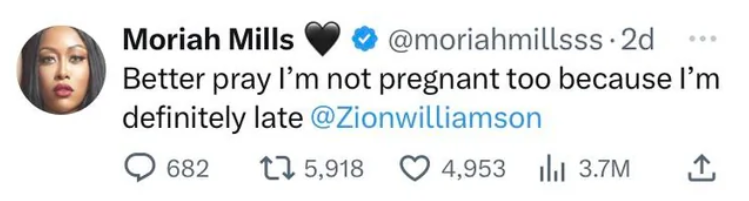 “Better pray I’m not pregnant too because I’m definitely late @Zionwilliamson”
