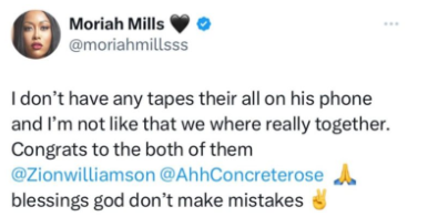 “I don’t have any tapes their all on his phone and I’m not like that we where really together. Congrats to the both of them @Zionwilliamson @AhhCreterose 🙏 blessings god don’t make mistakes ✌️”