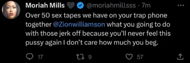 “Over 50 sex tapes we have on your trap phone together @Zionwilliamson what you going to do with those jerk off because you’ll never feel this pussy again I don’t care how much you beg.”