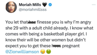 “You let that he finesse you is why I’m angry she 29 with a adult child already. I know what comes with being a basketball player girl. I know their will be other women but didn’t expect you to get these h** pregnant @Zionwilliamson 🤢🤢”