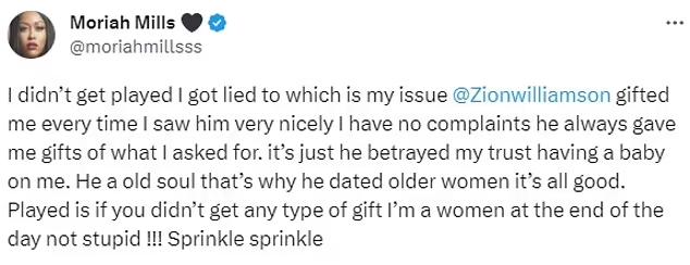 “I didn’t get played I got lied to which is my issue @Zionwilliamson gifted me every time I saw him very nicely I have no complaints he always gave me gifts of what I asked for. it’s just he betrayed my trust having a baby on me. He a old soul that’s why he dated older women it’s all good. Played is if you didn’t get any type of gift I’m a women at the end of the day not stupid !!! Sprinkle sprinkle”