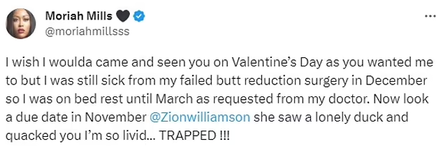 “I wish I woulda came and seen you on Valentine’s Day as you wanted me to but I was still sick from my failed butt reduction surgery in December so I was on bed rest until March as requested from my doctor. Now look a due date in November @Zionwilliamson she saw a lonely duck and quacked you I’m so livid… TRAPPED !!!”