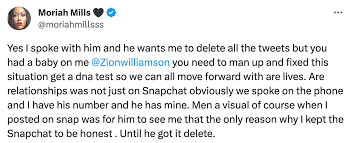 “Yes I spoke with him and he wants me to delete all the tweets but you had a baby on me @Zionwilliamson you need to man up and fixed this situation get a dna test so we can all move forward with are lives. Are relationships was not just on Snapchat obviously we spoke on the phone and I have his number and he has mine. Men a visual of course when I posted on snap was for him to see me that the only reason why I kept the Snapchat to be honest. Until he got it delete.”