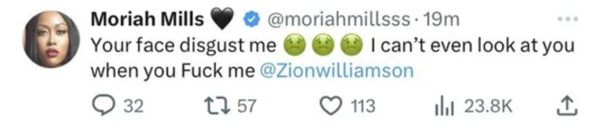 “Your face disgust me 🤢🤢🤢 I can’t even look at you when you Fuck me @Zionwilliamson”