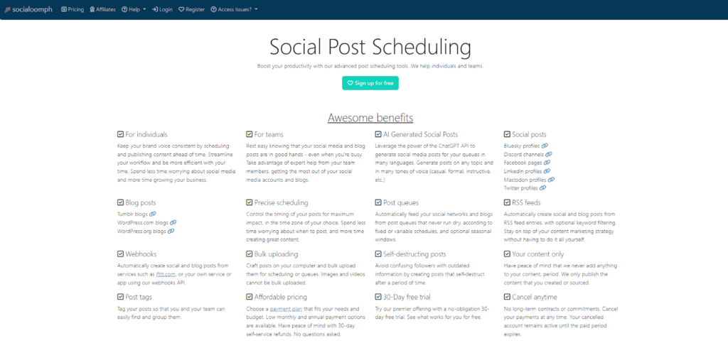 SocialOomph includes basic scheduling features in its free account. Paid plans start at $15 per month.