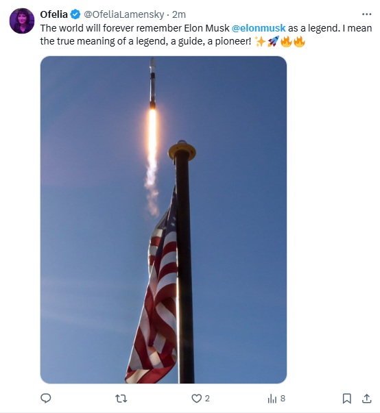 For example, a recent post by Ofelia tags Elon Musk (@elonmusk), drawing attention to her message by directly involving a well-known figure. This approach not only engages Elon Musk’s followers but also increases the chances of the post being seen and interacted with by a larger audience, boosting its overall reach.