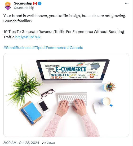For example, in a post by Secureship, hashtags like #SmallBusiness, #Tips, #Ecommerce, and #Canada help the post target specific audiences interested in these topics, expanding reach beyond the brand’s existing followers. This use of hashtags not only enhances engagement but also ensures that the post reaches a relevant audience who may benefit from the shared content.