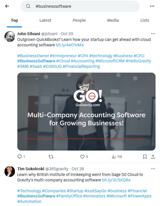 For example, a search for “#businesssoftware” brings up posts from users discussing cloud accounting software, such as Netsuite accounting, using related hashtags like #BusinessOwner, #Accounting, and #Technology. This provides a snapshot of popular and relevant hashtags in the business software niche.