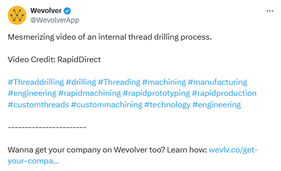 For example, a post by Wevolver includes a long list of hashtags, such as #ThreadDrilling, #machining, #engineering, #rapidprototyping, and more. While these hashtags are relevant, the excessive number can make the post appear cluttered and distract from the main message. Limiting the hashtags to a few key ones would help make the content more focused and engaging for the audience.