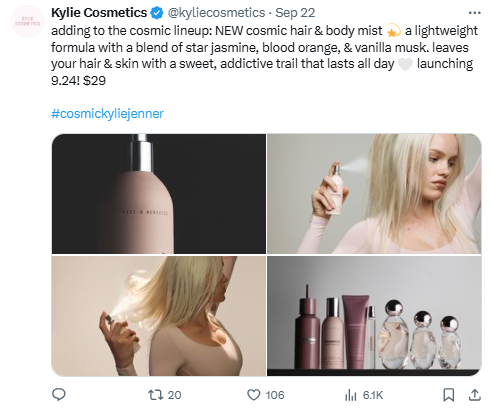 Kylie Cosmetics’ tweet promoting the new “Cosmic Hair & Body Mist” with #cosmickyliejenner supports brand awareness. The post introduces the product with engaging details and invites followers to explore related content, reinforcing brand identity and highlighting its appeal.