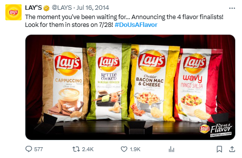 The tweet from Lay’s announcing the four finalists for their “Do Us a Flavor” contest with the hashtag #DoUsAFlavor is an excellent example of engaging the audience through an event-driven campaign. By inviting followers to look for the new flavors in stores, it builds anticipation and encourages fans to participate by voting for or sharing their favorite, thus creating buzz and interaction around the brand.