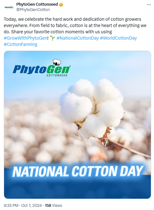 The tweet from PhytoGen Cottonseed encourages followers to share their own “cotton moments” using hashtags like #GrowWithPhytoGen, #NationalCottonDay, and #CottonFarming. By inviting users to participate in celebrating National Cotton Day, PhytoGen can gather user-generated content that highlights customer experiences and support, building a sense of community around the brand.