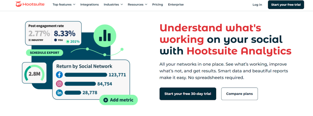 Hootsuite Analytics includes competitive analysis tools such as trending hashtag breakdowns, allowing users to identify top-performing options in specific niches. The drop-down menu lets users view those used by competitors to find the ones generating the most comments, reactions, shares, likes, and engagement. There’s also an option to publish directly with selected hashtags, streamlining the posting process.