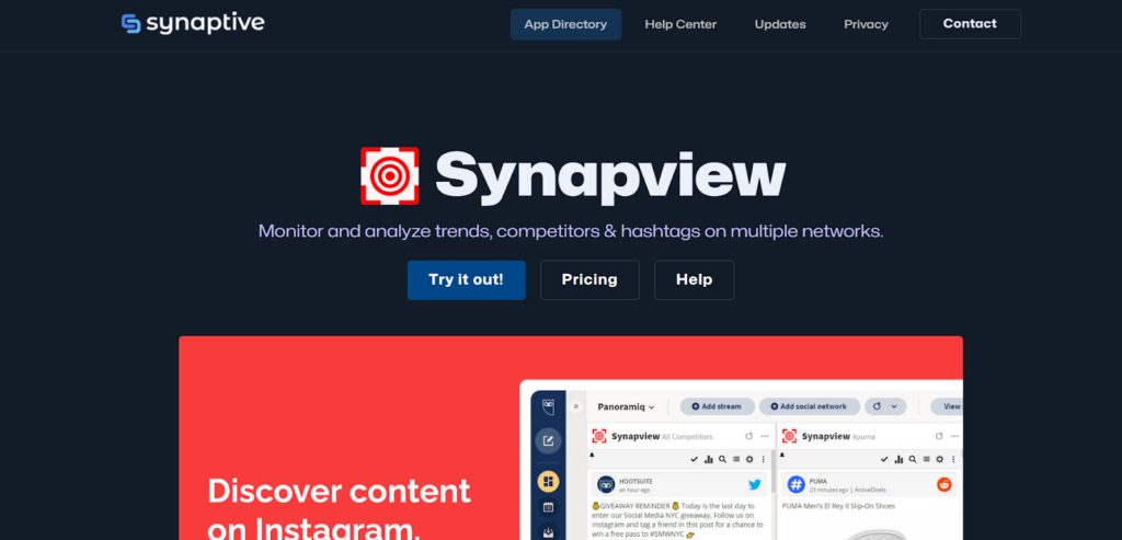Synapview enables users to monitor hashtag frequency on Instagram, Reddit, Pinterest, YouTube, and blogs. It supports complex searches by combining or excluding hashtags, helping users generate targeted results for analyzing specific audience behaviors and content trends.