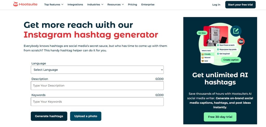 Hootsuite’s Instagram Hashtag Generator is a free, AI-driven tool that simplifies selection by using advanced algorithms powered by ChatGPT 3.5 to suggest impactful keywords based on user input. By describing the image or video content and adding a few relevant terms, users receive a tailored list aimed at enhancing reach and engagement. Key features include: