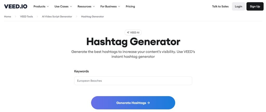 VEED’s Instant Hashtag Generator is an AI-driven tool designed to increase the visibility of social media content by generating up to 20 trending and relevant keywords. Users can input a keyword or brief description—such as an image caption, product name, brand, or location—and with one click, the tool provides tailored suggestions, enhancing potential reach and engagement on social platforms.