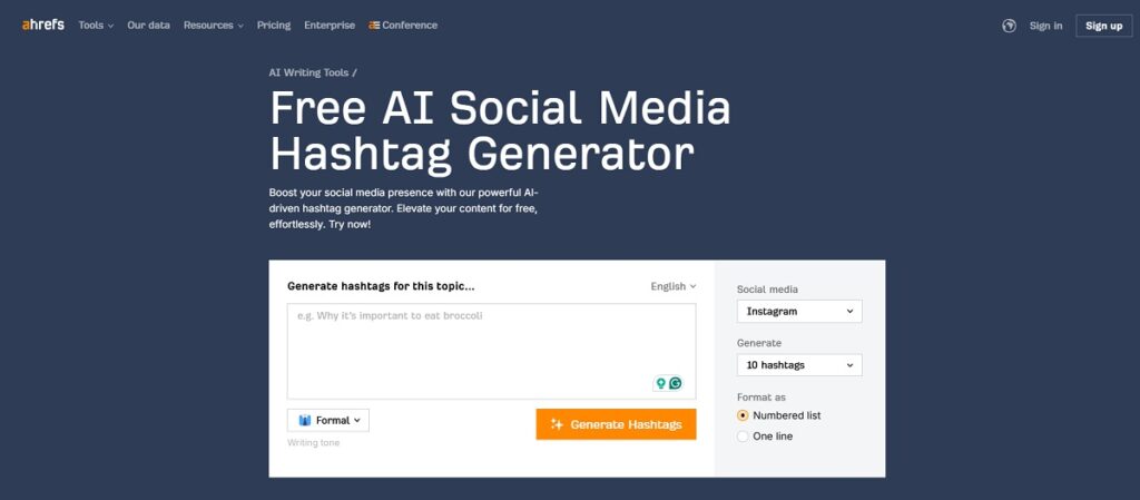 Ahrefs’ Social Media Hashtag Generator is a powerful tool for businesses, influencers, and marketers looking to enhance social media reach. This tool recommends trending tags aligned with content themes, helping users increase visibility on platforms like Instagram and Twitter and supporting both content marketing and SEO goals effectively.