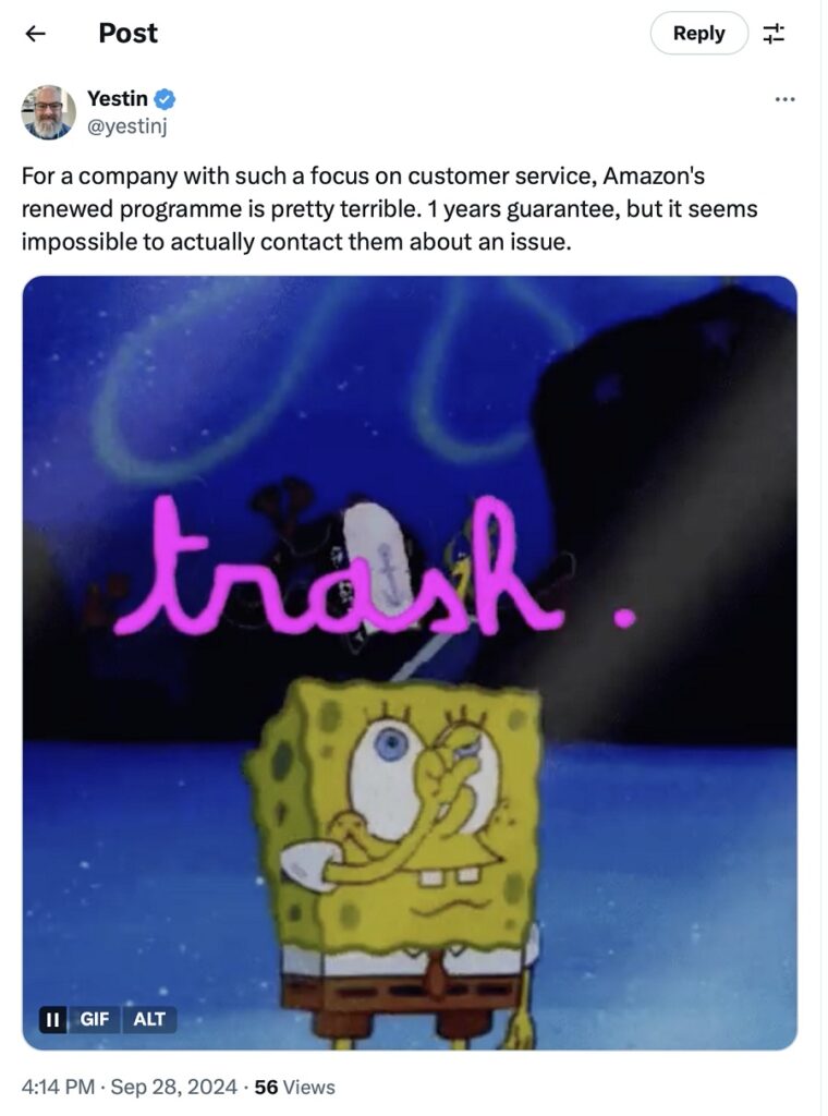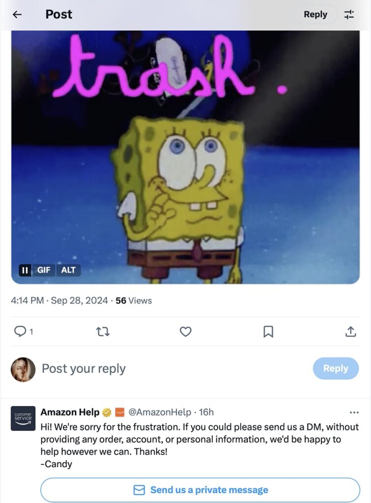 Here’s an example of a user complaining about Amazon’s customer service. They simply mention the brand’s name without tagging it directly using @.