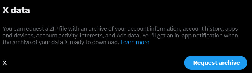 X will then begin processing your data. It may take from a few minutes to several hours. It depends on the size of your account and the amount of info X has to compile.