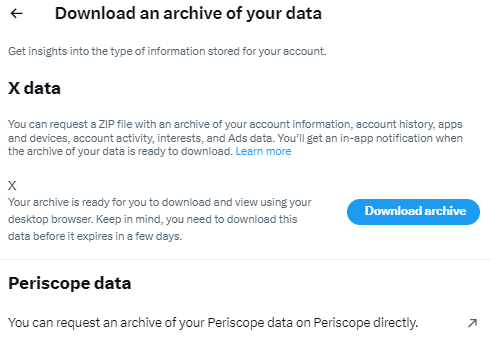 - Select ‘Download an archive of your data’;
