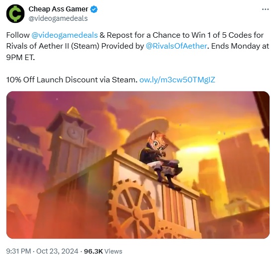 For instance, look at how brands like @videogamedeals offer giveaways to engage followers by sharing codes for games like Rivals of Aether II (Steam).