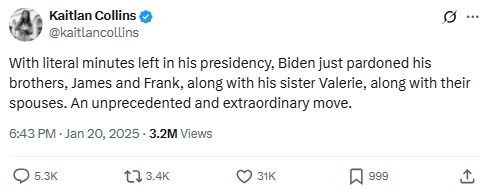 “With literal minutes left in his presidency, Biden just pardoned his brothers, James and Frank, along with his sister Valerie, along with their spouses. An unprecedented and extraordinary move.”