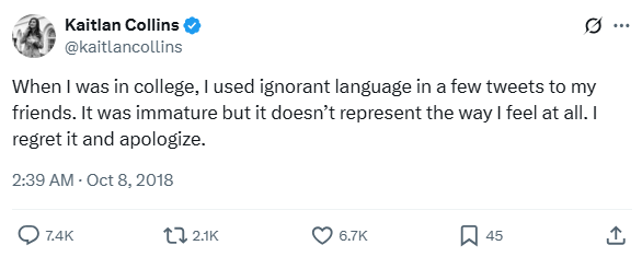 In 2018, Collins issued this public apology after offensive tweets she made as a student at the University of Alabama resurfaced. Prompted by the conservative LGBTQ group Log Cabin Republicans, the old messages circulated widely during a time of heightened scrutiny over public figures’ online behavior, particularly in the wake of the Brett Kavanaugh confirmation hearings.