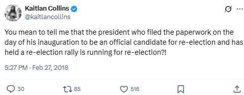 In this 2018 tweet, Collins sarcastically comments on Donald Trump’s early move to file re-election paperwork and hold rallies shortly after taking office. Her remark points out the unusual nature of Trump launching a re-election campaign on inauguration day, which some critics saw as prioritizing politics over governance.