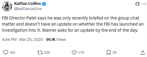 “FBI Director Patel says he was only recently briefed on the group chat matter and doesn’t have an update on whether the FBI has launched an investigation into it. Warner asks for an update by the end of the day.”