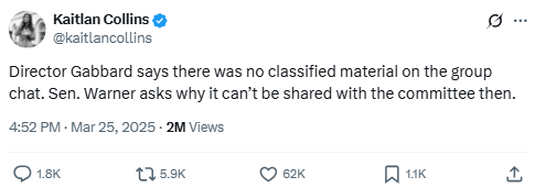 “Director Gabbard says there was no classified material on the group chat. Sen. Warner asks why it can’t be shared with the committee then.”