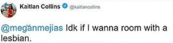 “@meganmejias Idk if I wanna room with a lesbian.”