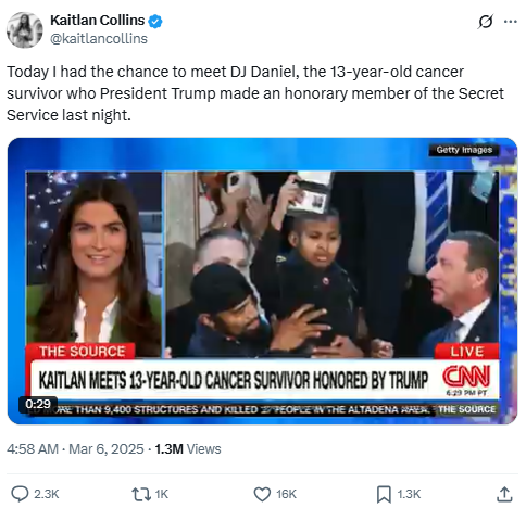 “Today I had the chance to meet DJ Daniel, the 13-year-old cancer survivor who President Trump made an honorary member of the Secret Service last night.”