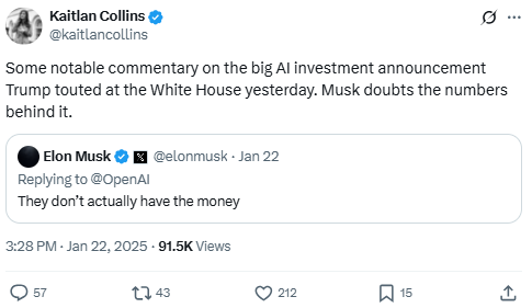 “Some notable commentary on the big AI investment announcement Trump touted at the White House yesterday. Musk doubts the numbers behind it.”