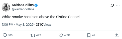 Collins marked a historic moment with this brief but impactful update signaling the election of a new pope. Cardinal Robert Prevost was named Pope Leo XIV, the first American pope in Catholic history. Her tweet received significant engagement due to the rarity and symbolism of the event.