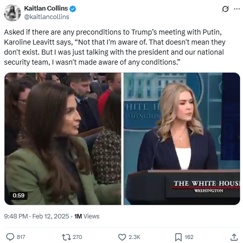 “Asked if there are any preconditions to Trump’s meeting with Putin, Karoline Leavitt says, “Not that I’m aware of. That doesn’t mean they don’t exist. But I was just talking with the president and our national security team, I wasn’t made aware of any conditions.””