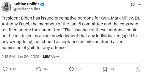 “President Biden has issued preemptive pardons for Gen. Mark Milley, Dr. Anthony Fauci, the members of the Jan. 6 committee and the cops who testified before the committee. “The issuance of these pardons should not be mistaken as an acknowledgment that any individual engaged in any wrongdoing, nor should acceptance be misconstrued as an admission of guilt for any offense.”