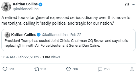 This tweet was part of the same developing story on military leadership shake-ups. Collins reported the change directly, sparking instant debate over military loyalty, diversity policies, and Dan Caine’s unusual rise to the top military post.