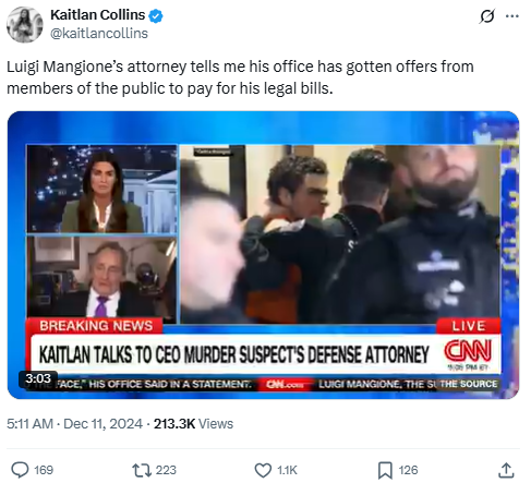 “Luigi Mangione’s attorney tells me his office has gotten offers from members of the public to pay for his legal bills.”