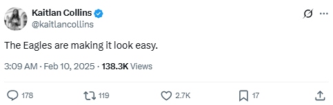 Reacting to Super Bowl LIX, Collins praised the Philadelphia Eagles’ dominant 40–22 win over the Kansas City Chiefs. Quarterback Jalen Hurts earned MVP honors with record-breaking rushing stats. As a known Eagles fan, Collins’ post resonated with sports followers and reminded her audience of her Alabama roots and NFL enthusiasm.
