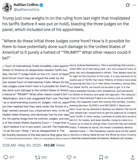 “Trump just now weighs in on the ruling from last night that invalidated his tariffs (before it was put on hold), blasting the three judges on the panel, which included one of his appointees.