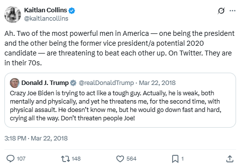 Kaitlan Collins comments on a 2018 Twitter exchange between Donald Trump and Joe Biden, both in their 70s, where they traded threats of physical violence. The incident followed Biden’s remarks suggesting he’d “beat the hell out of” Trump for past comments about women. Trump responded by calling Biden “weak” and warning he’d “go down fast and hard.”